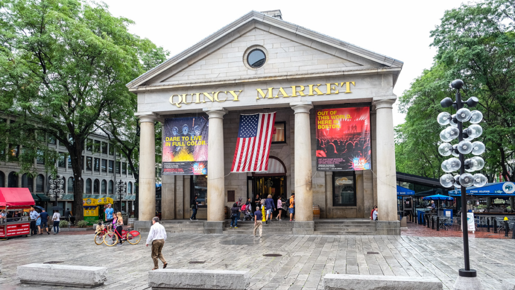 Before I stepped on, I walked to the nearby Quincy Market. Constructed in 1825, this is a huge structure with a domed central pavilion and Greek porticos. It consists of three long buildings, separated by tree-lined malls. There are rows of food stalls, shops, restaurants, a flower market, pushcart vendors and a gaggle of street entertainers all beckoning out to you to spend money.